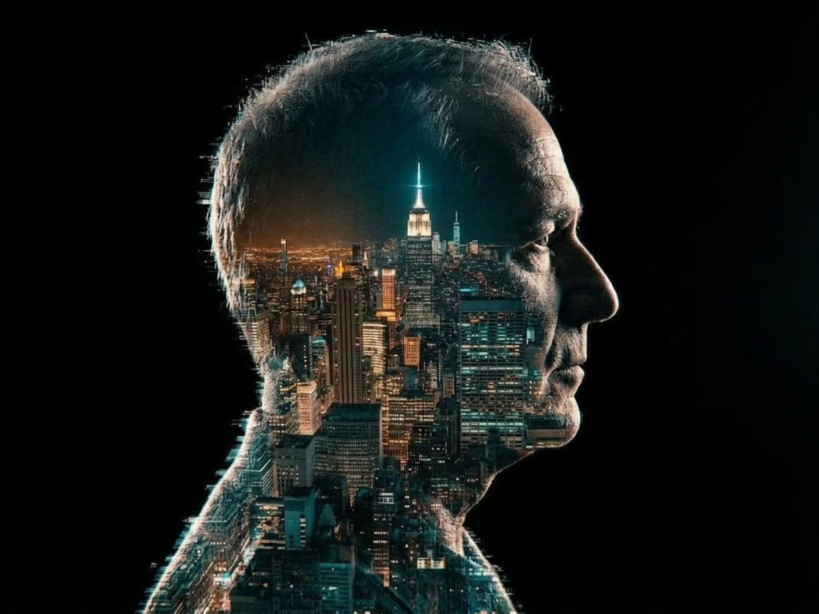 Distant skyscrapers and bustling cityscapes are seamlessly woven into the figure, surrounding the subject with a breathtaking urban horizon that naturally follows the contours of the body.